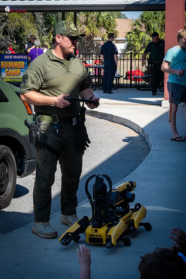 Police Robotics. Rounding out the lineup was a look at modern law enforcement technology, specifically the robotic units increasingly used for reconnaissance, bomb disposal, and situations too dangerous for a person to engage. Students were fascinated by the intersection of technology and public safety, and the officer staffing this station was clearly used to explaining it in terms that made sense to a curious audience.